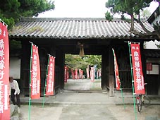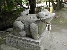仁王像が両側に納まる東門院の東門(右写真)を潜って境内に入ると、すぐ左にユーモラスな親子ガエルの石造があった。(左下写真)そばに手製の案内板が立っていた