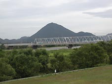 午前11時15分、野洲川に架かる野洲川橋を渡る。並行して架かるJR東海道線の鉄橋の上にピラミダルな近江富士(三上山)が見えた。(右写真)旧東海道夫婦旅では石部宿から草津に入るまで所々で見えた特徴のある山である。