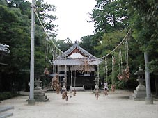 「行合ふれあい広場」の背後にある木立は行事神社の森である。女房をそこに残して行事神社に足を伸ばしてみた。鳥居をくぐると、本殿前に2本の鉄柱の間に渡して、枯枝が吊るされていた。これは1月に五穀豊穣を祈願して奉納された勧請吊(かんじょうつり)(左写真)というものである。この地方の神社に残る習慣である。
