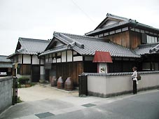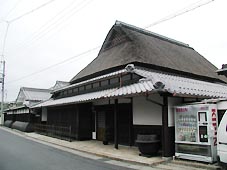 「外和木の標」の交差点から東へ斜めに中山道は続く。東海道新幹線を潜った先の左側に、城門のように石垣を積んだ門のある民家があり、その先に藁葺き屋根を残した造り酒屋が続いていた。(左写真)
