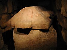 甲山古墳は玄室の中が見学できるようになっていた。中に入るとスイッチが入り案内が流れる。家形石棺の蓋の部分が意味ありげに横へずれている。(左写真)屋根部分に彩色の痕跡とみえる部分があった。外の案内板では触れてなかったから見間違いであろうか。
