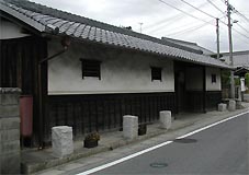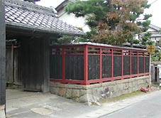 この辺りは野洲町辻町、白壁の重厚な長屋門(左写真の左)や、この辺りに多いのか黒く焼いた板に紅殻の縁取りがされた美しい塀(左写真の右)などが目に付く。