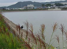 まもなく国道8号線に出て、しばらくは国道を行くことになる。午後2時5分、右手にススキの繁茂した土手が始まる。篠原堤と呼ばれる。篠原堤の歴史は古く、中世の旅行記「東関紀行」にすでに篠原に長い堤があったことが書かれているという。土手の向うは西池(右写真)である。灌漑用の池であろうか。中間辺りで土手に上がる道を見つけて登ってみた。思った以上に大きな池で真ん中の土手道で二つに分かれていた。釣人も見えた。