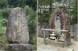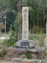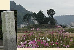 野洲町から竜王町鏡に入る少し手前に、街道は一度右側の旧道に分かれる。その集落に入った所に「明治天皇聖跡」の石碑(右写真の左)や愛宕山の御札の入った石碑(右写真の右)などがあった。