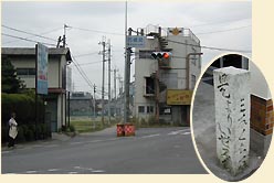 やがて旧中山道は善光寺川を渡り、午後3時32分、竜王町西横関の交差点に至る。右手前の角に石の道標が立っていた。(右写真の円内)一面に「是より いせみち」、もう一面には「ミなくち道」と刻まれていた。