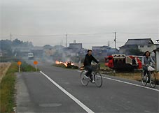国道8号線を進み、馬淵町から千増供町へ入り、右側の田んぼで野焼きをしていた。(右写真)火の勢いが大きくなりすぎて道路に炎がかぶり、自転車で抜けてきた女学生が驚いた顔をしていた。側には大型の稲刈機が置かれていた。気がつくと稲刈りも終えてあちこちで野焼きをしている。しかしあの火の勢いはルール違反であろう。