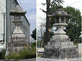 午後0時21分、愛知(えち)川に差しかかり、川岸に出た左側に石造の常夜燈があった。(左写真の左側)この常夜燈の笠部は神社の屋根のような形をして大変特徴的である。