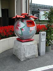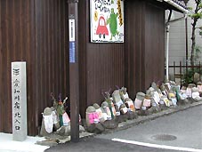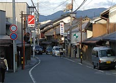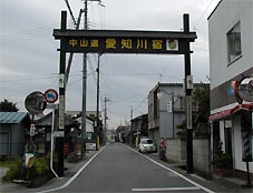 旧街道に戻ると間もなく入り口にあったと同じゲートがあった。(左写真)「愛知川愛盛会商業協同組合」と柱に書かれていた。町興しの会なのであろうか。紋章のように描かれた絵は「びんてまり」であった。