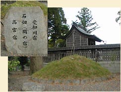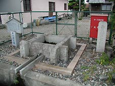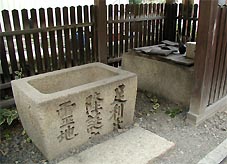 日が傾いてきた。左手に若宮八幡宮があるが、参道の小道の入口に「産の宮」の案内板があった。屋根を付けた下に、石組の井戸と四角く切り出した石の手水鉢があった。(右写真)手水鉢の前面には「足利氏降誕之霊地」と刻まれていた。葛籠町の地名は土着した家臣が生産した葛籠だという。