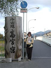 葛籠町を抜けてやがて犬上川に架かる高宮橋を渡る。橋を渡れば高宮宿に入る。橋の手前に大きな一枚板に「中山道 高宮宿」と書かれた看板が立っていた。(左写真)