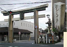 続いて太田川を渡ってすぐの四つ角右側に、道路をまたいで大きな石の鳥居があった。多賀大社の一の鳥居である。(右写真)この交差点から東へ3kmほど行った所に多賀大社がある。
