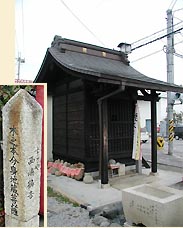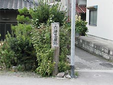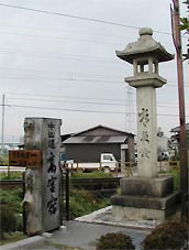 石清水八幡宮の向い側に「是より多賀みち」の石標が立っていた。(右写真)高宮宿の「多賀大社一の鳥居」の所にあった「是より多賀みち三十丁」の石標と字体が同じであった。同時期に作られたものであろう。下の丁数の部分が塗りつぶされている。距離的には「多賀大社一の鳥居」の石標からとそれほど違わないと思う。おそらく別の所から移されてきて丁数が合わなくなって塗りつぶしたものであろう。