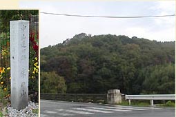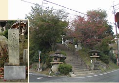 1kmほど進んだ左側に小山があり、階段が山上の石清水八幡宮に通じる。(左写真)その階段途中の斜面に「扇塚」がある。(左写真の左端)
