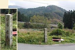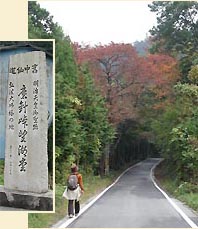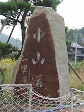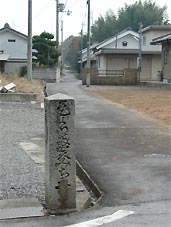 中山道は国道8号線を200mほど進んで、国道から右へ別れて山道になるが、その入口に「磨針峠望湖堂」の石碑があった。(左写真の左端)「舊中仙道 明治天皇御聖跡 弘法大師縁の地 磨針峠望湖堂 是より東へ山道八百米」と刻まれている。