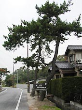この先は自然なカーブや藁屋根の家も残り、旧街道らしい道が続く。所々に松並木も残る。(左写真)看板に「彦根八景 旅しぐれ 中山道松並木」とあった。