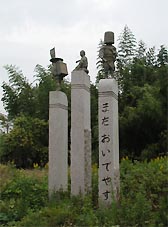 国道8号線に出る手前の緑地に彦根の入口にあった三本の石柱の上の旅人像がここにもあった。(右写真)間もなく彦根市ともお別れになる。「またおいでやす」と石柱に刻まれている。入口の方には「おいでやす彦根」と刻まれていた。思わずデジカメを向けていると、道路わきの畑仕事のおばさんから声が掛かり、「みんなそこで写真を撮って行くよ」。ここで立ち止まり、写真を撮って行く旅人を毎日のように見送っているのであろう。苦笑いするしかなかった。