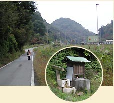 左手に山が迫り、右手には車が行き交う名神高速道路、その挟間に付けられた道を行く。(右写真)途中左の山際に「泰平水」と命名された湧水口と祠があった。(右写真の円内)かっては旅人の喉を潤したものであろう。
