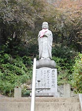 本堂の右側に宝篋印塔が一基。(左上写真の右)これは前述の鎌刃城の開基城主、土肥三郎元頼公の墓だという。番場の忠太郎地蔵尊の看板に導かれて、本堂の右横を通って進むと、石段の上に合掌した石の地蔵尊が立っていた。(右写真)