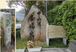 午後3時13分、すぐ先で県道240号線との交差点に掛かった。渡った左側には「中山道 番場宿」の大きな碑が建つポケットパークがあった。(左写真)そして渡る手前の左角に、「米原汽車汽船道」の石標が立っていた。(左写真の左端)その石標を見落としていたので戻ってみた。石標には方向を示す指印が浮き彫りにされている。慶長年間に米原港が開かれて、この道を左折して4kmでその港に至る。その道は中山道と米原港をつなぐ産業道路として開かれたた。中山道の貨客を米原港に導くための道路であった。