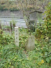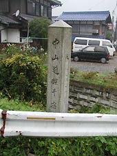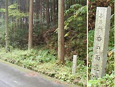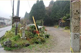 すでに坂田郡山東町に入っていた。午前11時09分、旧道が国道と接する所に、梓河内のバス停がある。すぐそばの草むらの中に、「墓跡黒谷遺跡」の石標が立っていた。(左写真)そばに案内板もあるが、文字が消えてしまって読めない。黒谷遺跡の石標と隣に、「左 中仙道」の石碑があった。