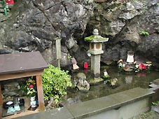 午前9時29分、地蔵川に沿って200mほど行った右側に、地蔵川の川名の由来となった延命地蔵尊の御堂が、川向こうの迫る山との間の狭い境内に雨に濡れていた。(左写真)醒井延命地蔵尊と呼ばれている。「ハリヨ」の水槽もここにあった。