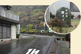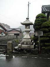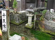 雨は降り止まない。地蔵川は道の右側に流れている。十王水という標識があった。向かい側の人家の間から細い流れが合流する所に、竿柱に「十王」と刻まれた石燈籠があった。(左写真)この人家の裏手から湧き出している泉を「十王水」という。近くに十王堂があったためという。