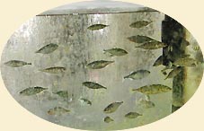 ハリヨはこの先の醒井延命地蔵尊の境内の水槽の中で見れた。(右写真)口先と尾の尖った木の葉のような小魚である。地蔵川に繁茂する藻の中に白い花がちらほらと見えた。ハリヨとバイカモの案内板があった。