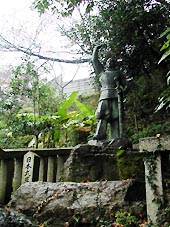 醒井延命地蔵尊の隣に地蔵川の源流の清水が湧き出す「居醒(いざめ)の清水」があった。(左写真)山の斜面に、かって、「醒井の不断桜」という天然記念物の桜があったが、枯れてしまった。その後、桜のあった位置にヤマトタケルの銅像が建てられた。(右写真)どうしてこの地にヤマトタケルなのかという疑問は案内板が晴らしてくれた。