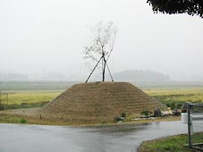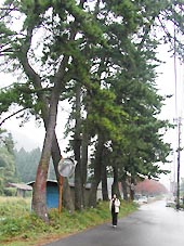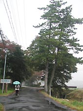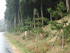 雨の中を歩いて行くと、左側の山際に松の幼木が一列に植えられていた。(右写真)案内板には「街道並び松 中山道宿駅制定400年記念植樹」、また「柏原学区史跡保存会 平成14年(2002)3月」と書かれていた。ごく最近に植えられたものである。