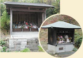 近くに石仏や五輪塔が沢山集められた祠が二ヶ所あった。(右写真)路傍やあるいは黒谷遺跡から出てきたものかもしれない。