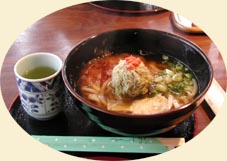 すでに午後1時近く になっていたので、出口西側の「軽食喫茶 柏」に入った。メニューに「やいとうどん」というのがあった。柏原宿の名物は「もぐさ」である。ならば、「やいとうどん」を食さない訳にはいくまい。出て来たうどんは、もぐさの代わりのおぼろ昆布を大きな「やいと」の形に積み上げ、火種の代わりに刻んだ紅生姜が載っている。(左写真)これで400円。
