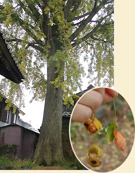左に少し入った所に了徳寺がある。了徳寺には国の天然記念物に指定されている「御葉附銀杏」があった。(右写真)女房がギンナンを拾ってきた。(右写真の円内)葉から芽を出して発育不全のギンナンが付いている。お葉付イチョウといえば、山梨県に上沢寺(国)、本国寺(国)、八木沢(国)、顕本寺(県)の四本、静岡県にも静岡市安居の石蔵院にお葉付イチョウがある。