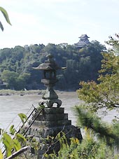 思わぬ道草をしてしまった。目的は犬山城である。県道27号線に出て南へ。JRと名鉄の踏切を渡り400mほどで木曽川河畔に出る。犬山橋の手前を右折して川に沿って少し進む。すでの対岸に犬山城が見えている。写真にあった常夜燈を建物の向こう側に見つけて前景に常夜燈、川の向こうに犬山城を入れて写真に取った。(右写真) 常夜燈の周りの雑木が大きくなって、なかなかいい構図にならなかった。