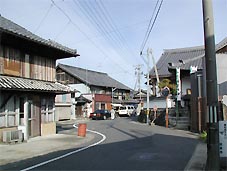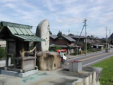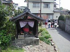 木曽川岸から県道27号線を取って返し、国道21号線との交差点から東へ20mほどずれた細い坂道を北へ登る。午前10時45分、100mも行かないうちに前回の最後に見たお地蔵さんの辻に出た。(左写真) ウォーキングのイベントでもあるのか、親子ずれの家族が三々五々辻を横切り東へ向かって行く。我々はそれに逆らって、中山道を北へ向かう。