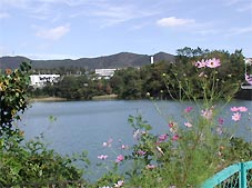 坂道は突き当って合戸(かっこ)池に至る。左側に池を見ながら進む。コスモスが咲いていた。(左写真)