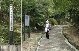 中山道は公園内の石畳の道をまっすぐに進む。少し登った左側に「市指定史跡 旧中山道うとう峠一里塚」の標柱が立ち、案内板があった。(右写真) 林の中で少し小高くは見えるが、一里塚の形がは確認できなかった。