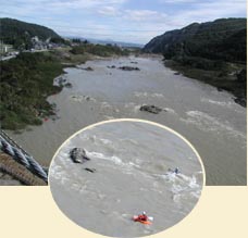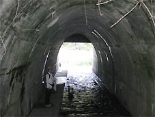 午前11時34分、うとう峠の最後に水路トンネルを抜けた。(左写真) 丸型の部分はJR高山線、角型の部分は国道21号線を潜っている。階段を登って木曽川河畔の国道に出た。木曽川は泥色の上薬のような濁流が流れている。かなり高いところまで草木の屑が引っかかり、水がそこまできていたことを示していた。