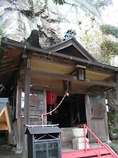 国道21号線を800mほど進んで、左から岩山がせり出した直下に、岩屋観音堂への急な石段が付いている。岩屋観音堂は岩山にへばり付くようにあった。(右写真) 中山道の旅人がこの難所を安全に通行出来るように祀られているという。