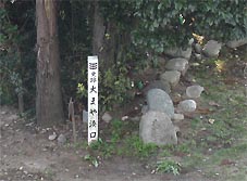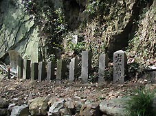 岩屋観音堂の参道に、石碑類が玉垣のように並んでいた。(左写真) 刻まれた文字を読むと、「岩窟觀世音」「太田宿 林観兵ヱ」「京都 金百疋 東洞院三条下 白木屋文右ヱ門 近江屋好兵衛」「金二百疋 彦根■■」「金百疋 鵜沼宿 問屋庄屋■本陣 野口貞■■」など、中山道の沿道の各地から寄進を受けていることが判る。「疋」は「銭を数える語。古くは鳥目一〇文を一疋とし、後に二五文を一疋とした。(広辞苑)」