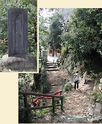 この先の中山道は岩山を削って造った棚状の道が東へ続いている。(右写真) 往時の中山道はこんな雰囲気だったんだろうと思う。少し登った踊り場のような位置に「巖屋坂の碑」と刻まれた大きな板碑があった。(右写真の左上) この坂は「観音坂」と呼ばれているが、別名「岩屋坂」とも呼ばれていたのであろう。