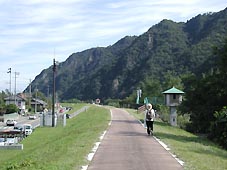 この後コースを土手の上に取った。土手の上は茶色の舗装がされて、右に木曽川、左に国道21号線、その向こうに集落が続いている。