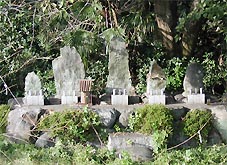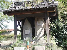 案内書に、「右江戸善光寺 左せきかじた」と刻まれた道標が残っているとあったので、途中で国道へ降りて道標を探しながら歩いたが、見逃してしまったようで、そのうちに木曽川に向いた緩斜面に墓地が広がるところへ出てしまった。お寺は墓地より高いところにあるようだ。堤防の無い時代には何年かに一回は墓地が木曽川の濁流に洗われたのかもしれない。墓地の側の壊れそうな祠の中に、2体の石の地蔵像が祀られていた。(左写真) 石像には元禄八年(1695)とか、文化十四年(1817)の年号が読めた。後日調べたら、そこのお寺の名前を付けて、「宝積寺の石仏」と呼ばれているようだ。