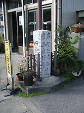 100m進んで右折するが、その突き当たった店の前に、三面に「左 西京伊勢 右 関上有知」、「名古屋市塩町四丁目 伊藤萬蔵」、「明治二十五年六月建之」と刻まれた石標があった。(右写真) この道標は太田小学校の庭に移されているとあったが、本来あったこの場所にいつ戻されたのであろう。隣りに高札場跡の案内板があった。