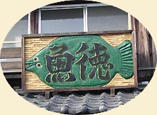 中山道に戻って枡形をたどる。街道が北へ道路の幅ほどずれたすぐ左側に面白い看板を見つけた。(右写真) 古い魚屋さんの「魚徳」の看板である。色は最近塗りなおしたものであろうが、大変明快な看板であった。額縁部分がかなり時代を感じさせる。