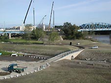 国道21号線に降りて歩道を5分ほど歩くと、前方に土手と勝山陸閘(りくこう)が見えてきた。(右写真)