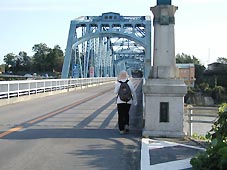 ところが国道248号線の太田橋に歩道も自転車道もなかった。人の通る白線すら引いてなかった。どうも現在歩道の工事が進んでいるようであるが、もちろん我々には間に合わない。これはかなわないと河原に降りることにした。意外と整備は進んでいて、泥を踏まなくて済むかと思ったが、最後に泥の上を渡らなければならず、シューズを汚してしまった。橋の中間辺りに上って、残り半分をやはり歩道のない道を渡った。(左写真) 車が来ない間に進んで欄干に張り付いて車をやり過ごす。「達磨さんが転んだ」のように進み、ようやく渡り終えた。こんな恐ろしい経験は東海道の天竜川の橋以来であった。