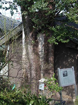 左手土手下に深田神社を見ながら進み、国道41号線が木曽川を渡る中濃大橋の手前で、土手から下った所の虚空蔵堂裏にムクノキの巨木がある。(左写真) このムクノキは坪内逍遥ゆかりのムクノキといわれている。大正八年の記念写真が案内板に載っていた。80余年前と今で変らないのはムクノキだけである。いや少し太くなって変ったか。とにかく3m以上は問題なくクリアしているから、これを「太田宿の巨木」とする。