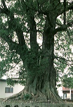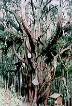 無数の幹や枝が主幹に絡み付き樹冠が大きく広がっている。赤い幹が暗い林の中でも鮮やかである。昔、ディズニーのアニメで夜の森で騒ぐ目鼻の付いた巨樹の場面があったが、そんなキャラクターを感じる巨木であった。どうしてこの木が切られずに残ったのか、その歴史をたどるときっと面白いドラマがあったのであろう。