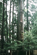 雨上がりの濡れた石段を上がると高千穂神社の境内は巨木の森であった。石段を登りきった左に秩父杉がある。林立する巨木の中では、そんなに巨木に見えないから不思議だ。表側三分の一ほど縦に杉皮が剥がれ無残に見えるが堂々としている。