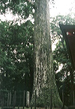 八村杉を見て、戻ると茶店でお茶を飲んでいけと声をかけられる。居合わせた郵便屋さんとお茶をよばれる。山家にしては品のあるおばさんだが、白く塗った化粧がわざとらしい。まるで平家の末裔の都人を装っているかのように見える。おばさんの話では一本に見える幹も高い所で二本に分かれているという。森の樹冠を遠望すると、確かにとび抜けた部分が二つに分かれているのが確認出来た。